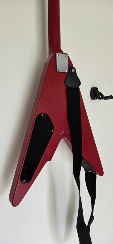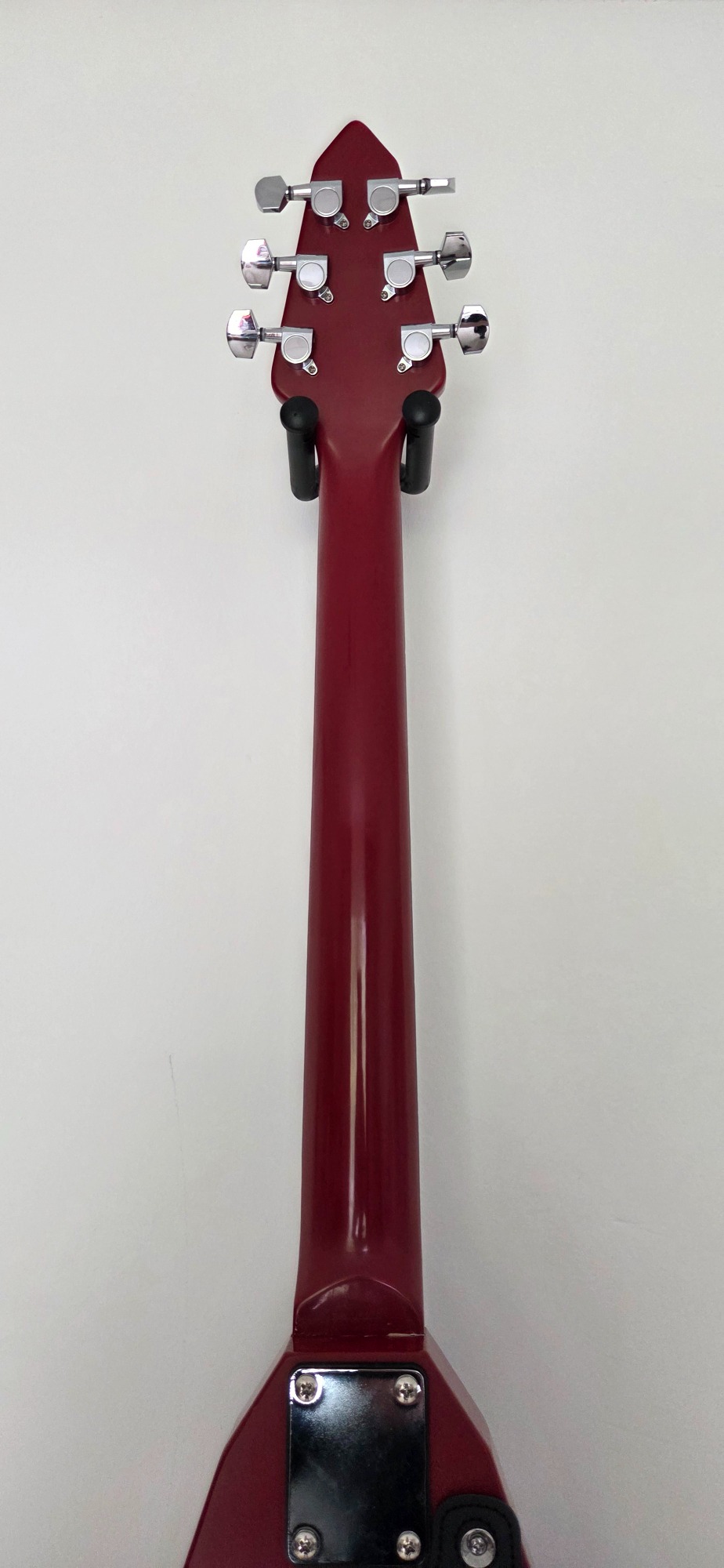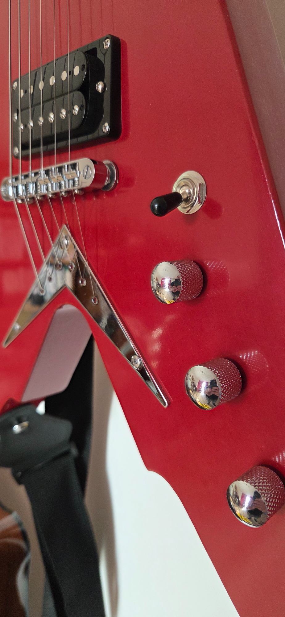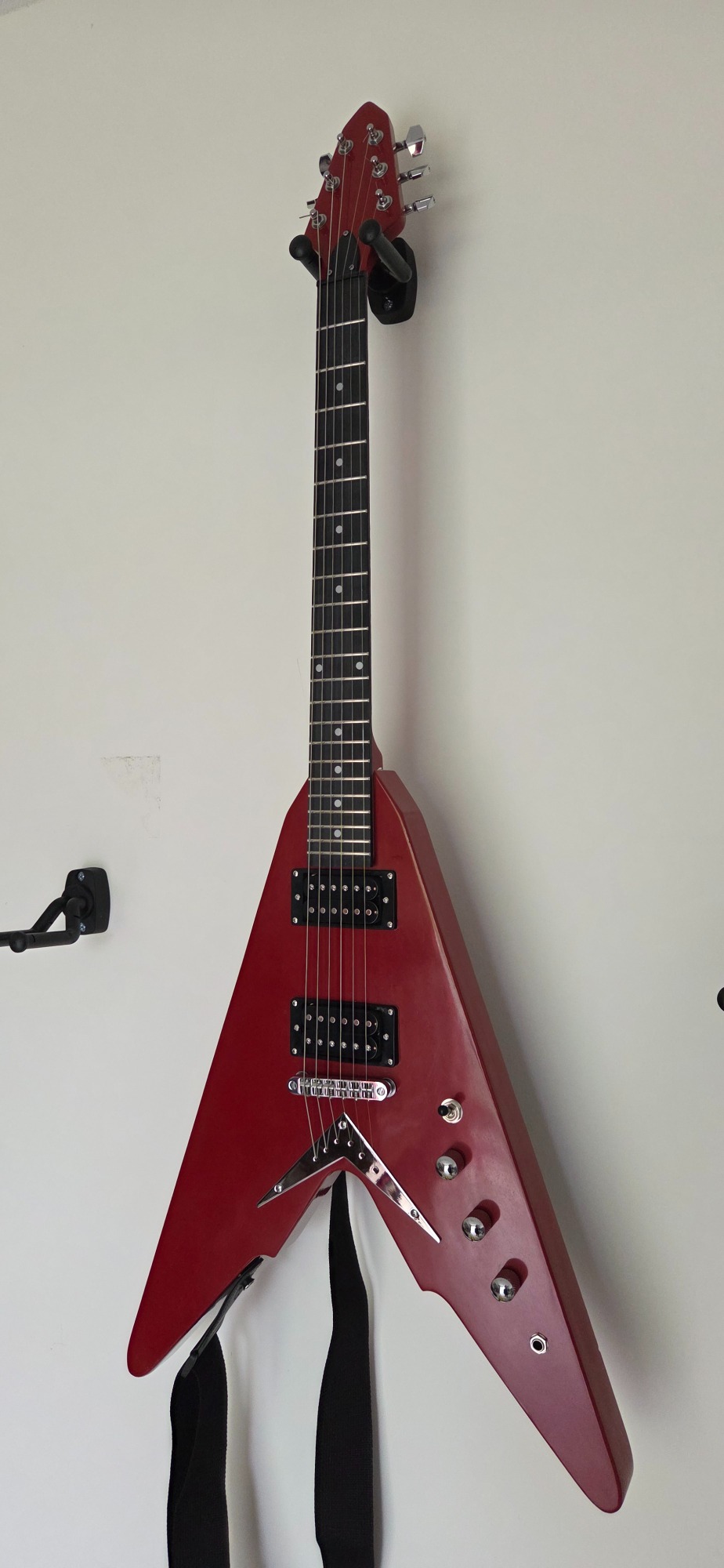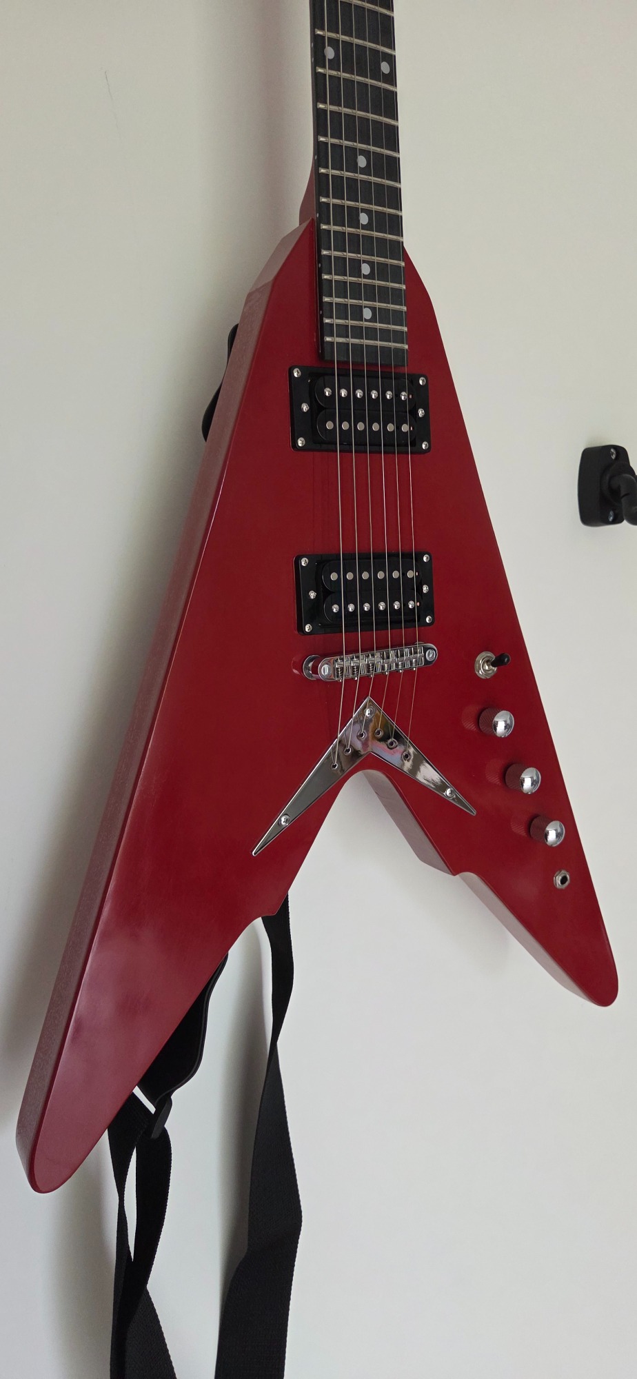 Fying V Deep Red: Screwed neck / Body: Limewood / Neck: Maple wood / Fingerboard: Roseacer / Trapezoidal inlays / Double action truss rod / 22 Frets / Pickups: 2 humbuckers / 2 Volume and 2 Tone controls / 3-position switch / Hardware: Chrome / Strings: .010 - .046 / Colour: Deep Red with gloss finish