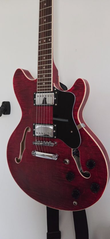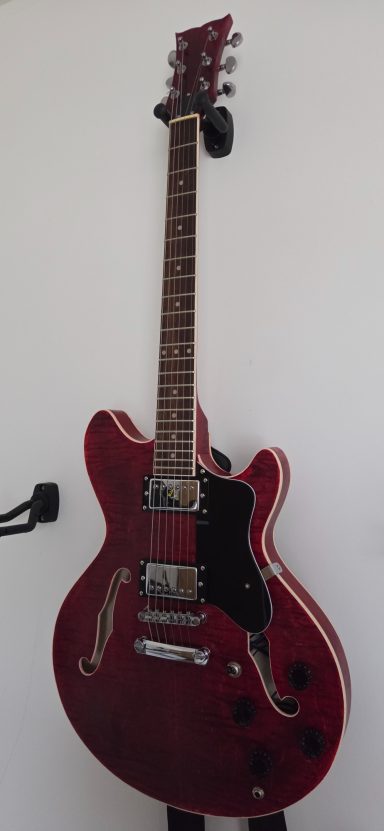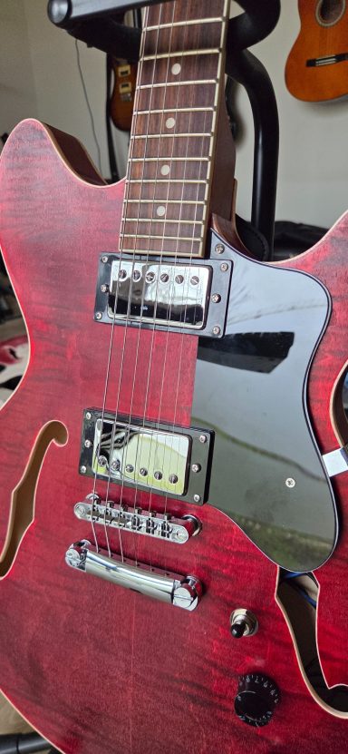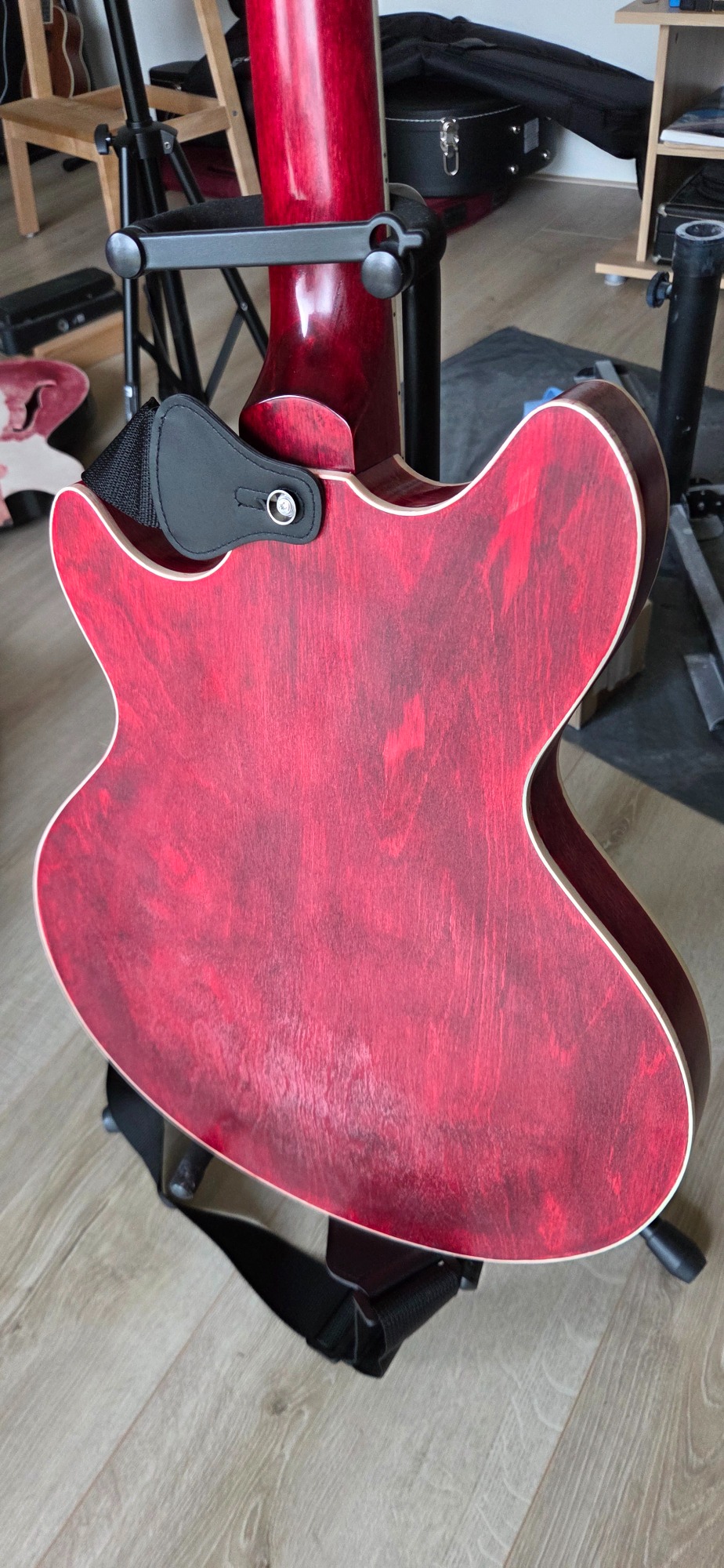 Hollow-body Red Stain: Screwed neck / Body: Paulownia / Neck: Maple wood / Fingerboard: Rosewood / Dot inlays / Double action truss rod / 22 Frets / Pickups: 2 humbuckers / 2 Volume and 2 Tone controls / 3-position switch / Hardware: Chrome / Strings: .010 - .046 / Colour: Red stain with gloss finish