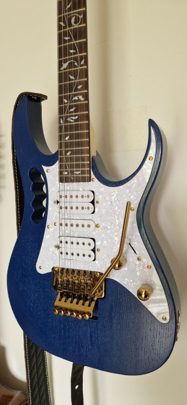 JEM model blue: Screwed Neck / Ash body / Maple neck / Rosewood fingerboard / double action truss rod / 24 frets Tree of Life neck / Bridge with tremolo arm / Bridge, middle & neck pickups / Volume and Tone Control / 5-position switch / Hardware: Gold / Strings: .009 - .046 / Colour: Sapphire blue with gloss finish