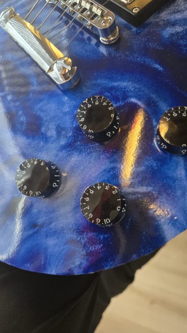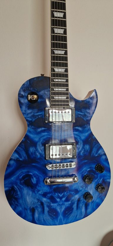 We're building this LP model with a very nice Rengas wood finish, looking stunning, that you can still see on the sides and the back. Then, the front is adorned with a vinyl sticker, ensuring a spectacular front view. If you want a different sticker, please contact us.